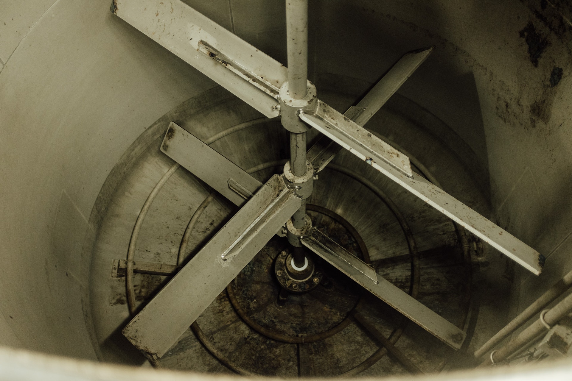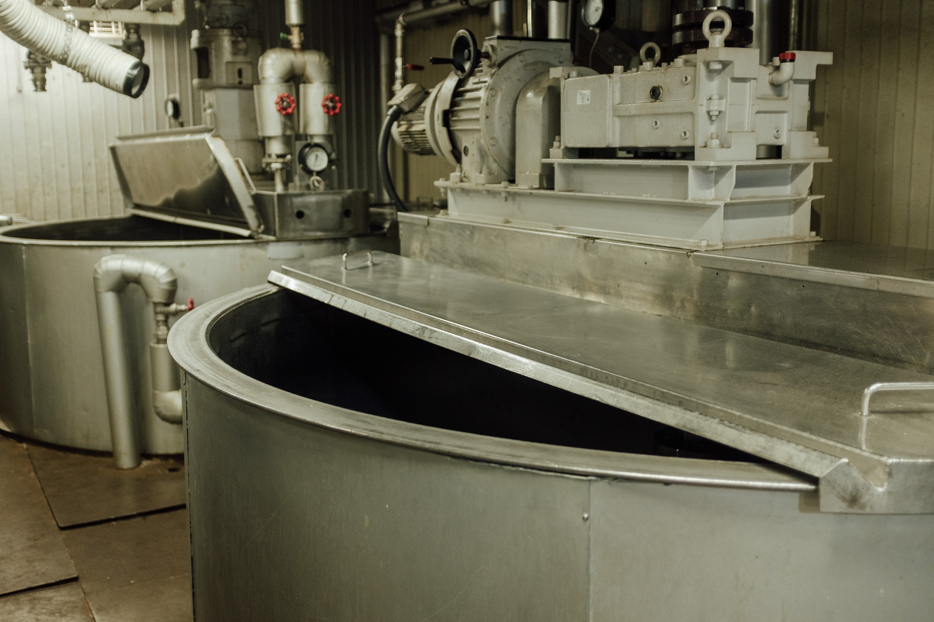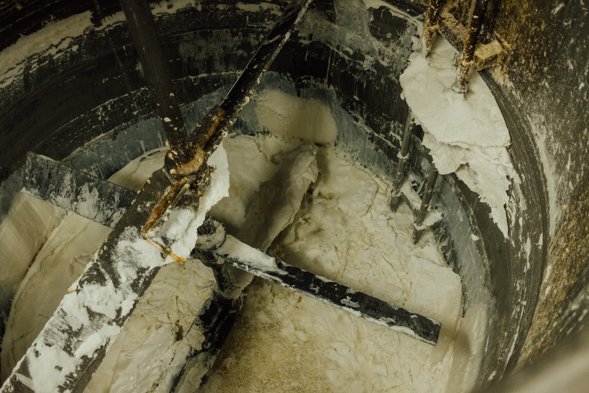 原料の天然油脂を釜に入れ、加熱・撹拌しながら苛性ソーダをあわせ、鹸化(けんか)させます。出来上がってだいぶ取り出してしまっていて残り1/3くらいの状態です。下の写真が綺麗になった状態の釜。