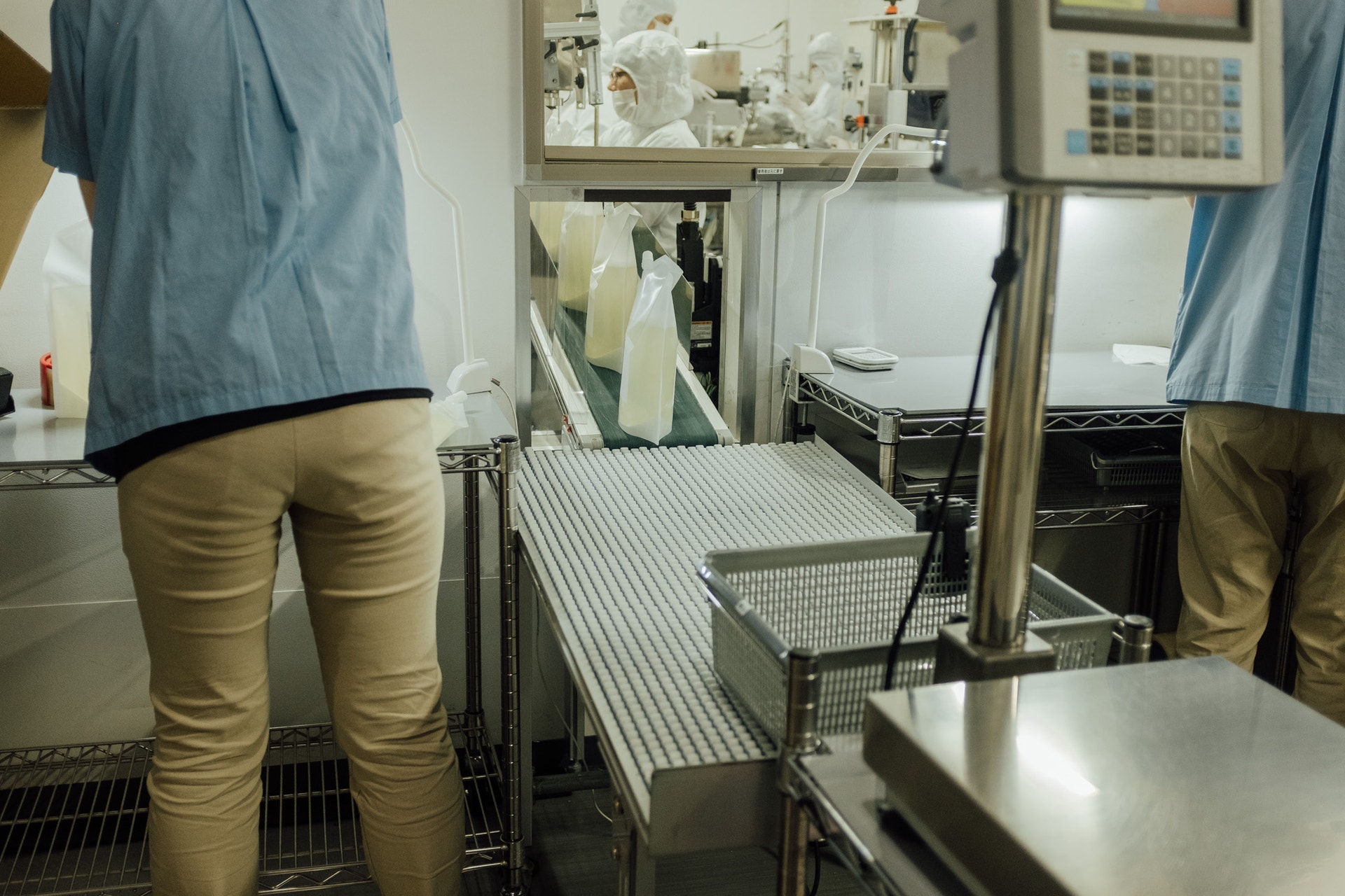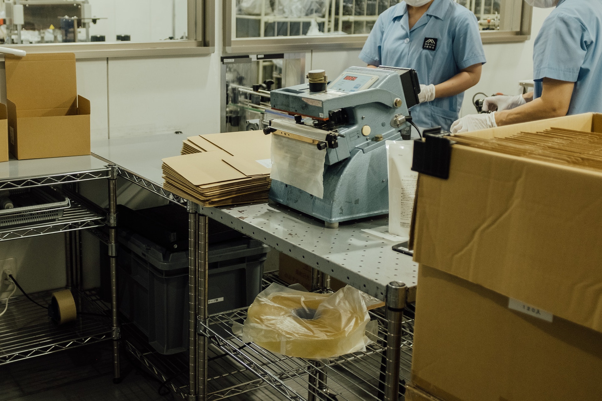 中では詰め替えパック、小瓶への充填作業を行い外では梱包作業と流れ作業で業務を行います。一見全てがアナログな作業に見えるんですけど、実は機械化されてるところもあって、ラベルシールを貼る機械なんかはちゃんと形状をAIで判断して向きが揃うようになっていたりして効率化もされているんです。