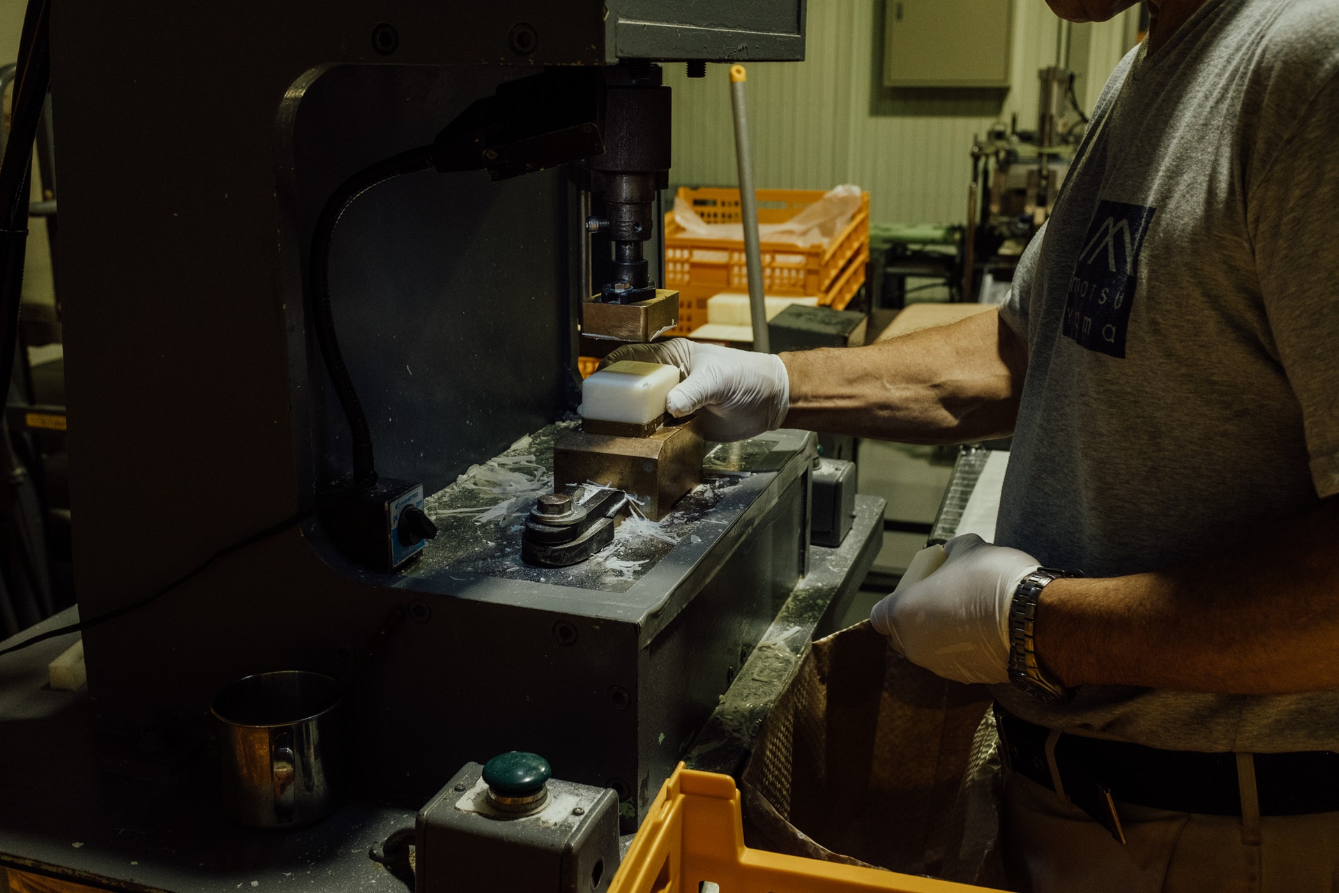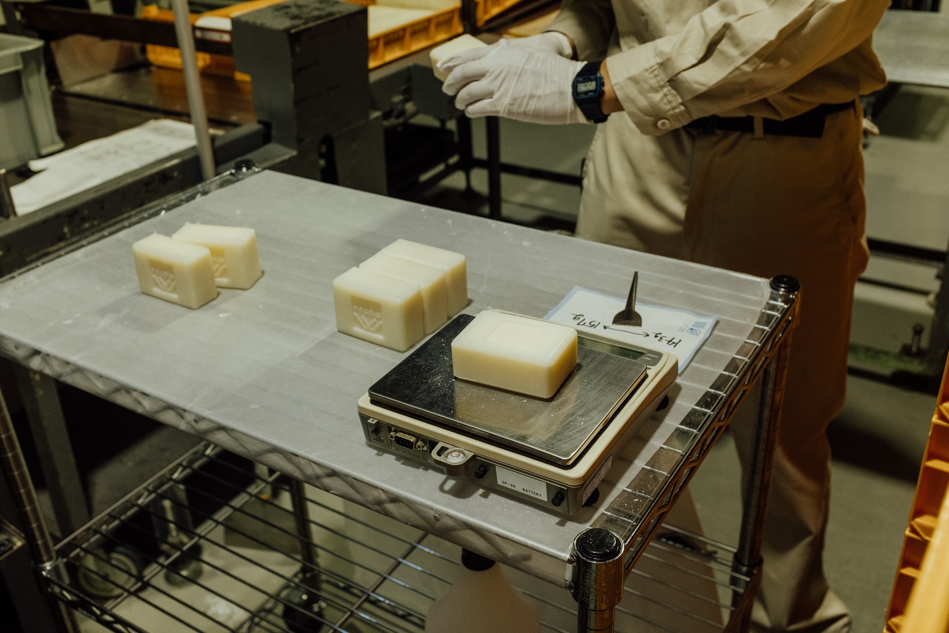この石鹸のカットの作業も微妙に大きさや形が違ったりするそうで、そこに刻印するのも職人さんの技術が必要になってきます。打ち込む深さなど、本当に職人芸です。