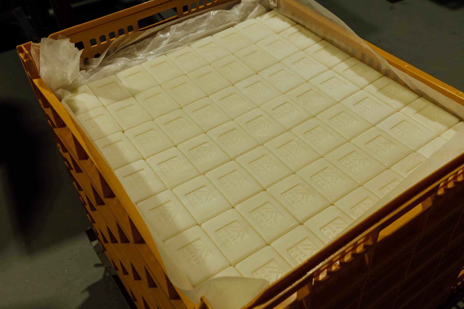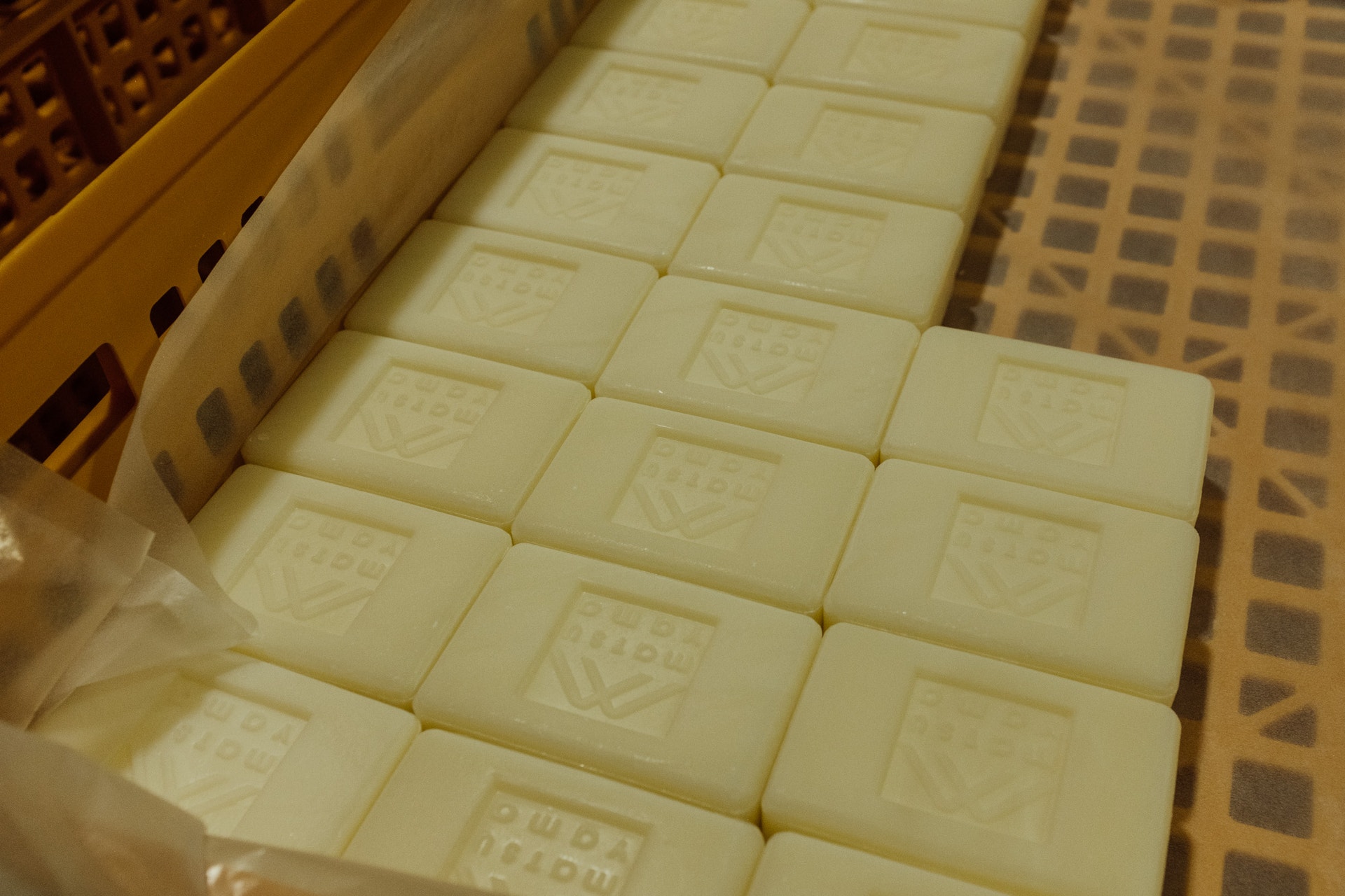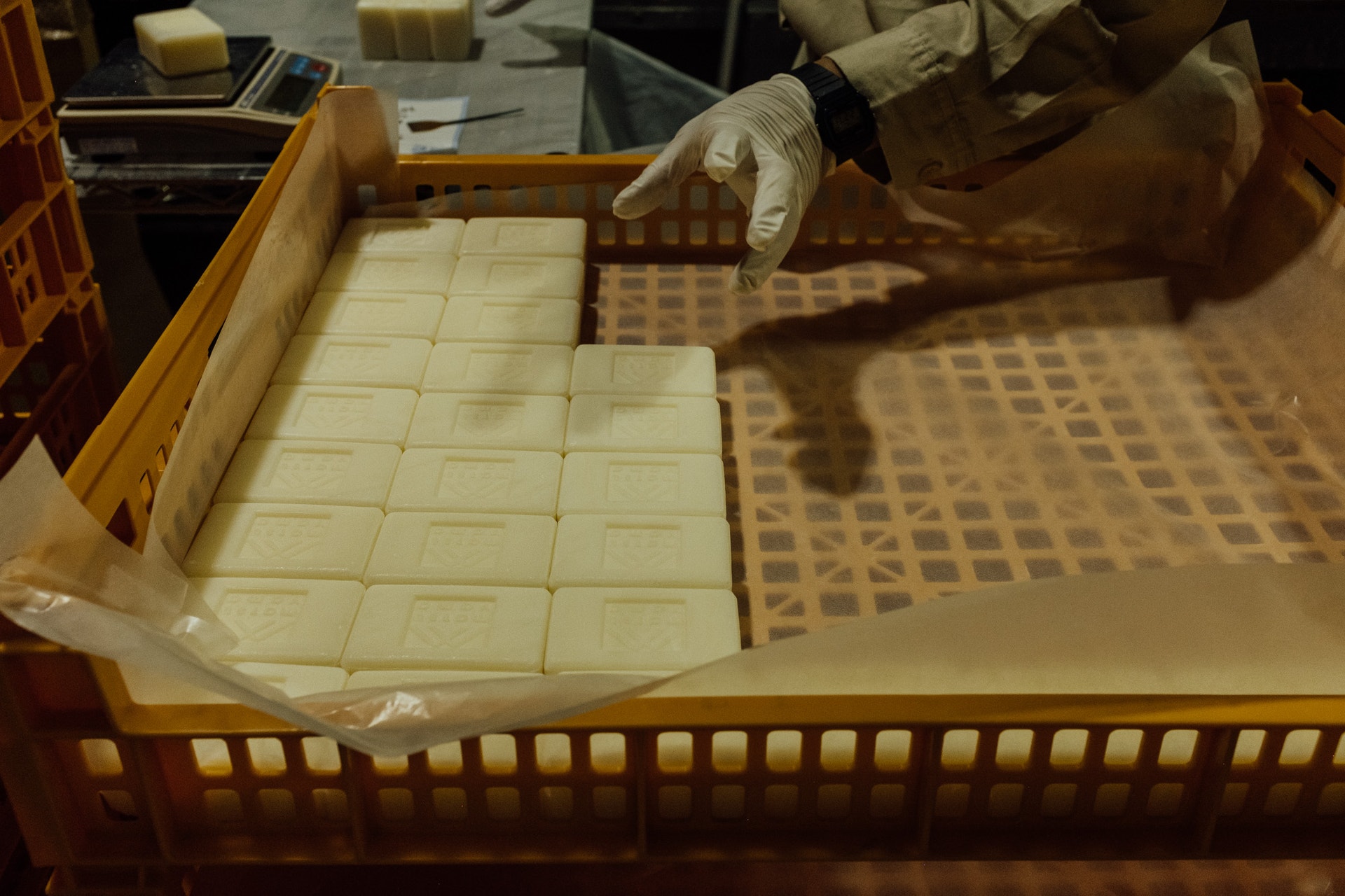 カットされた石鹸にひとつひとつ丁寧に刻印をしていきます。実はこの段階では完全に乾燥しておらず、少し柔らかい状態でマークを打ち込みます。完全に乾くと割れてしまうからなんですね。…確かに。