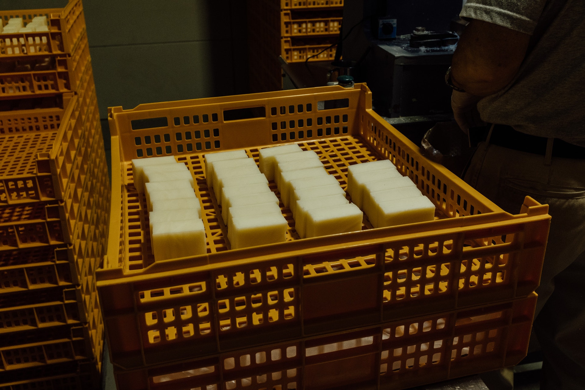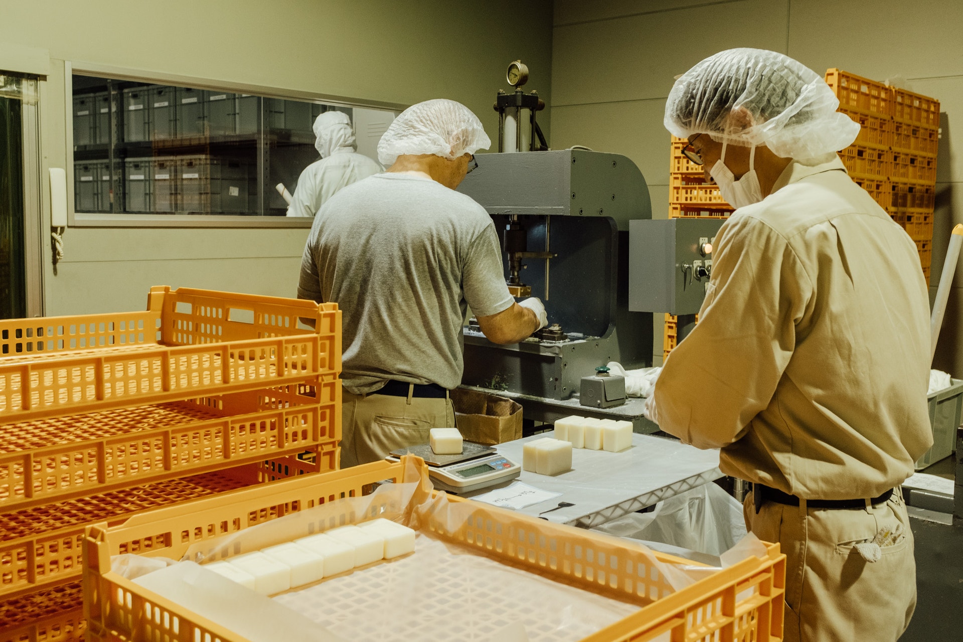 釜場はめちゃくちゃ暑くて(涼しいと凝固しちゃいますしね!)作業する方はほんと大変だと思います。この時釜場の説明をしてくださった方は、松山油脂唯一の女性で釜場を担当している方。めちゃくちゃ若いんですけど、技術をちゃんと継承していて格好いいなって思いました。