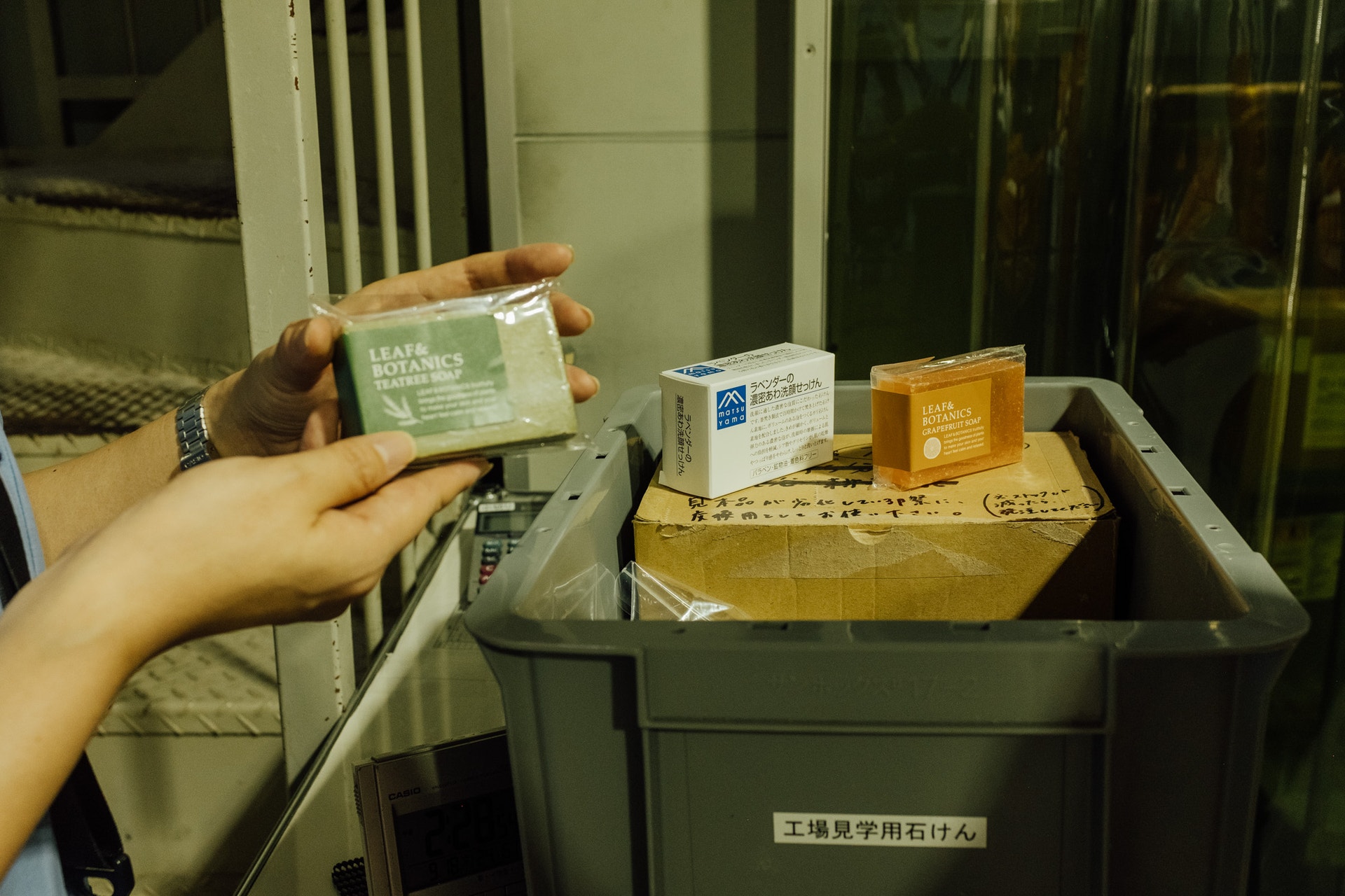 打った横では検品をして、どんどん番重(これも番重でいいのかな?)に乗せられていきます。松山油脂のMマークを施された石鹸は、どこか誇らしそうにも見えました。