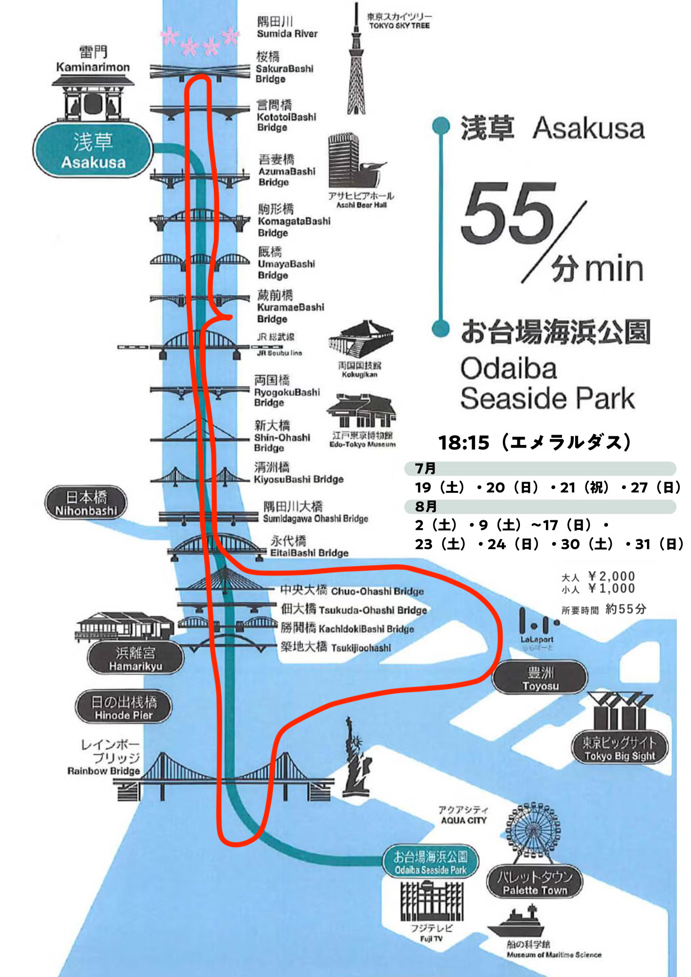 当初は通常の水上バスの「浅草〜お台場便」に乗るつもりだったのですが、臨時便がちゃんと出るかどうか問い合わせをしたところ、当日はだいぶ水位が上がると予想で一番遅い時間の臨時便(=夜景が見れそうな便)が出ない可能性が高い!ということで、似たルートの別のクルーズで実施しました。