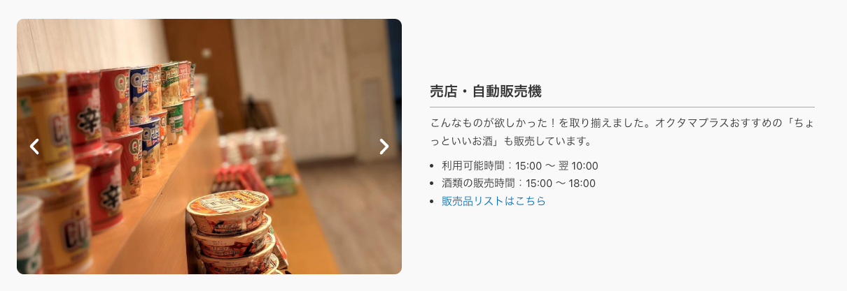 また、館内には簡単な売店&自販機があるので小腹が空いたら買うこともできます!(車組が買い出しもできますが、近場にはコンビニくらいしか無い感じ)